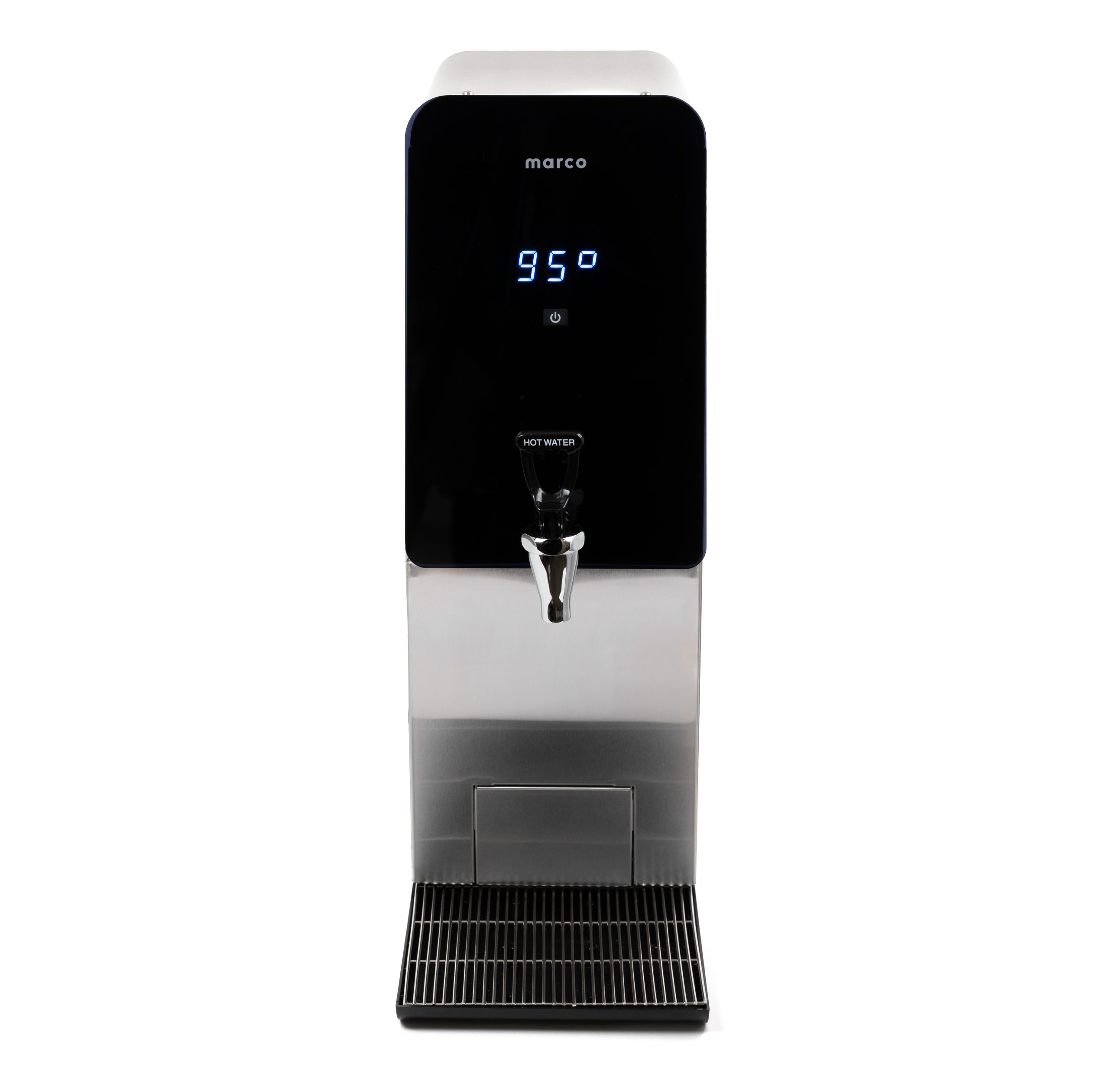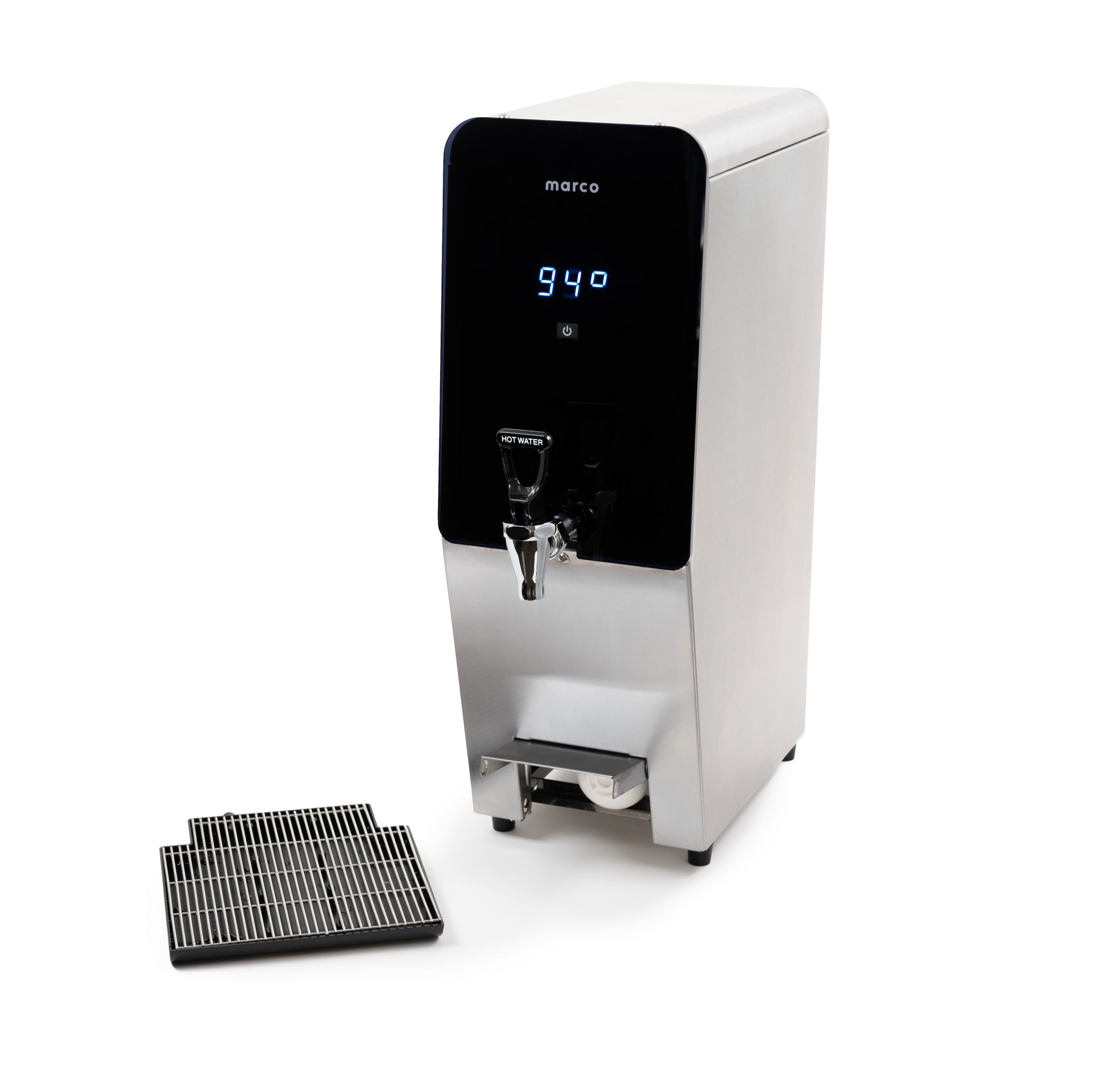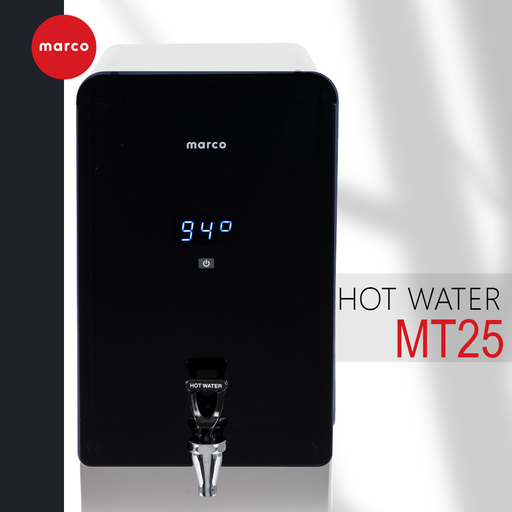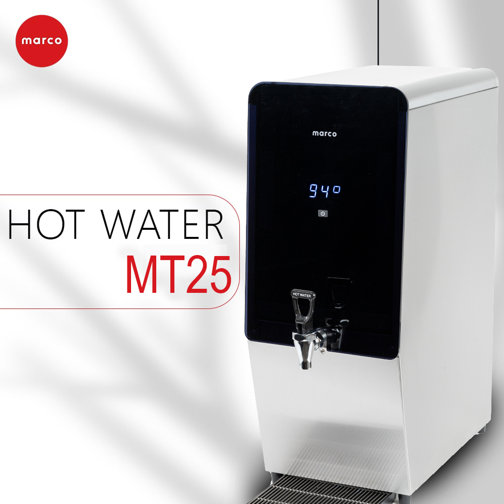 دستگاه آب گرم کن تجاری Marco MT25 با ظرفیت بالا، مصرف انرژی بهینه، مخزن ۲۵ لیتری (۶.۶ گالنی)، ساختار استیل ضد زنگ و فضای اشغالی کم، تا ۱۵۶ فنجان آب گرم در ساعت تولید میکند و دارای نمایشگر دمای LED، لولهکشی آسان (۳/۸ اینچ یا John Guest)، سینی چکه جداشدنی و قابلیت کارکرد بدون دخالت دست (اختیاری) است و برای کافهها، ادارات و رستورانها مناسب است.